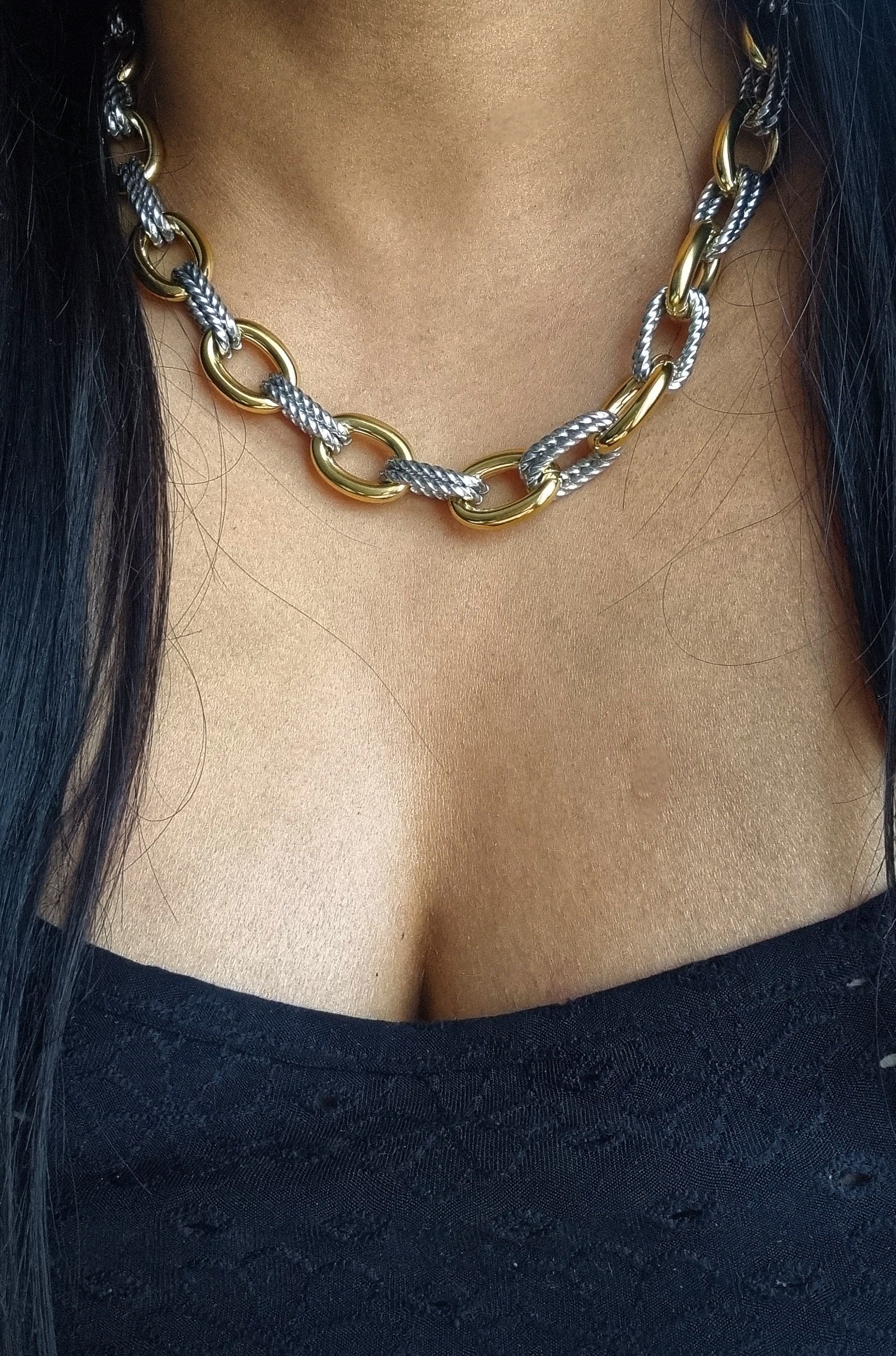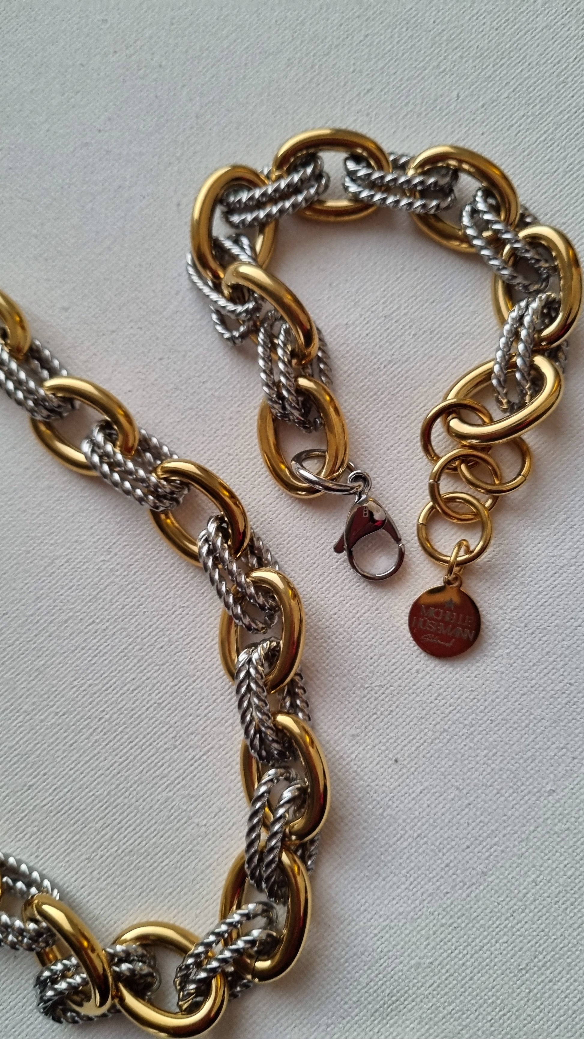 Dieses Halsketten und Armband Set mit ineinander verschlungenen Gliedern vereint Gold und Silbertöne perfekt. Das MAJESTY Set ist aus Edelstahl mit einer 18K Vergoldung gefertigt; ein kühnes, elegantes Stück, das bereit ist, Ihre Looks bei jeder Feier aufzuwerten.